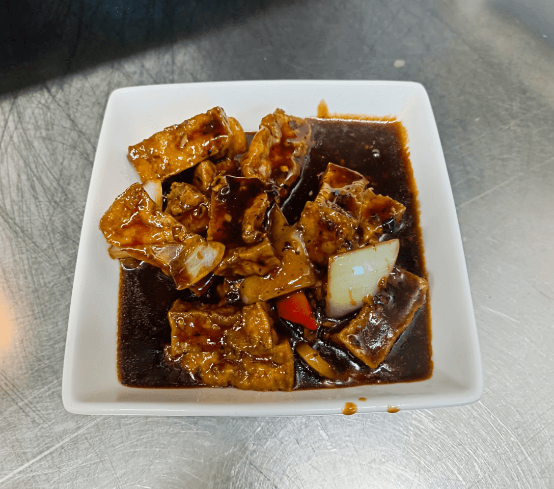 Golden fried tofu cooked with chilli, garlic, onion, and peppers in traditional Chinese black bean sauce.