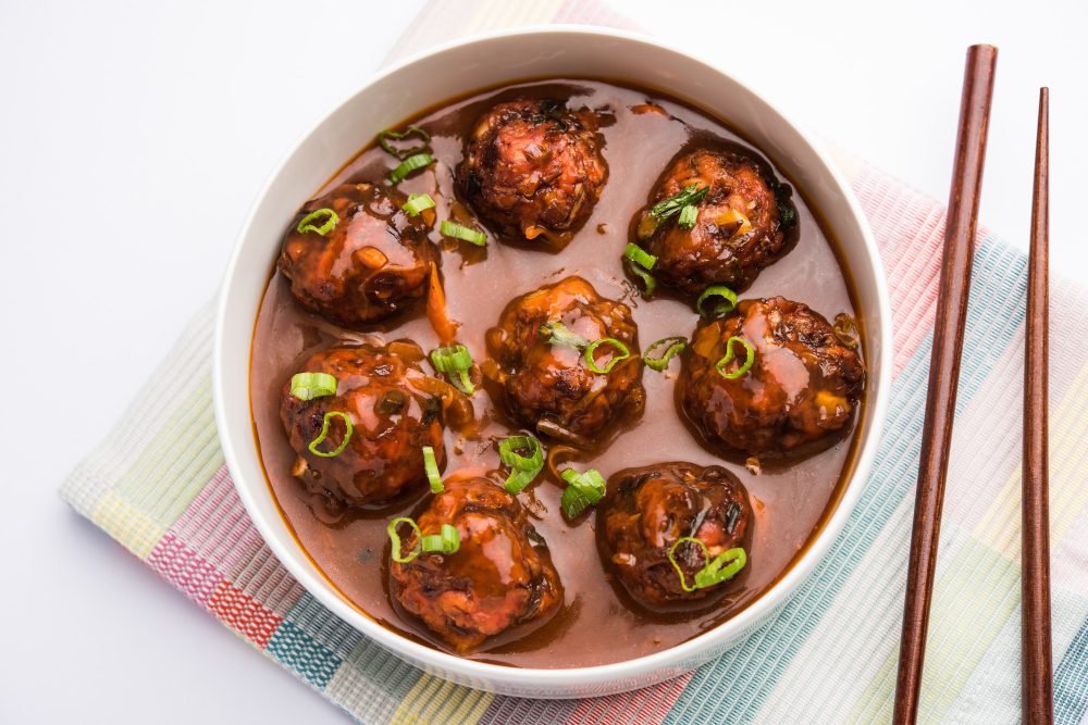 A true desi style coated fried cauliflower topped with ginger, garlic, chopped onion, coriander & soya sauce.